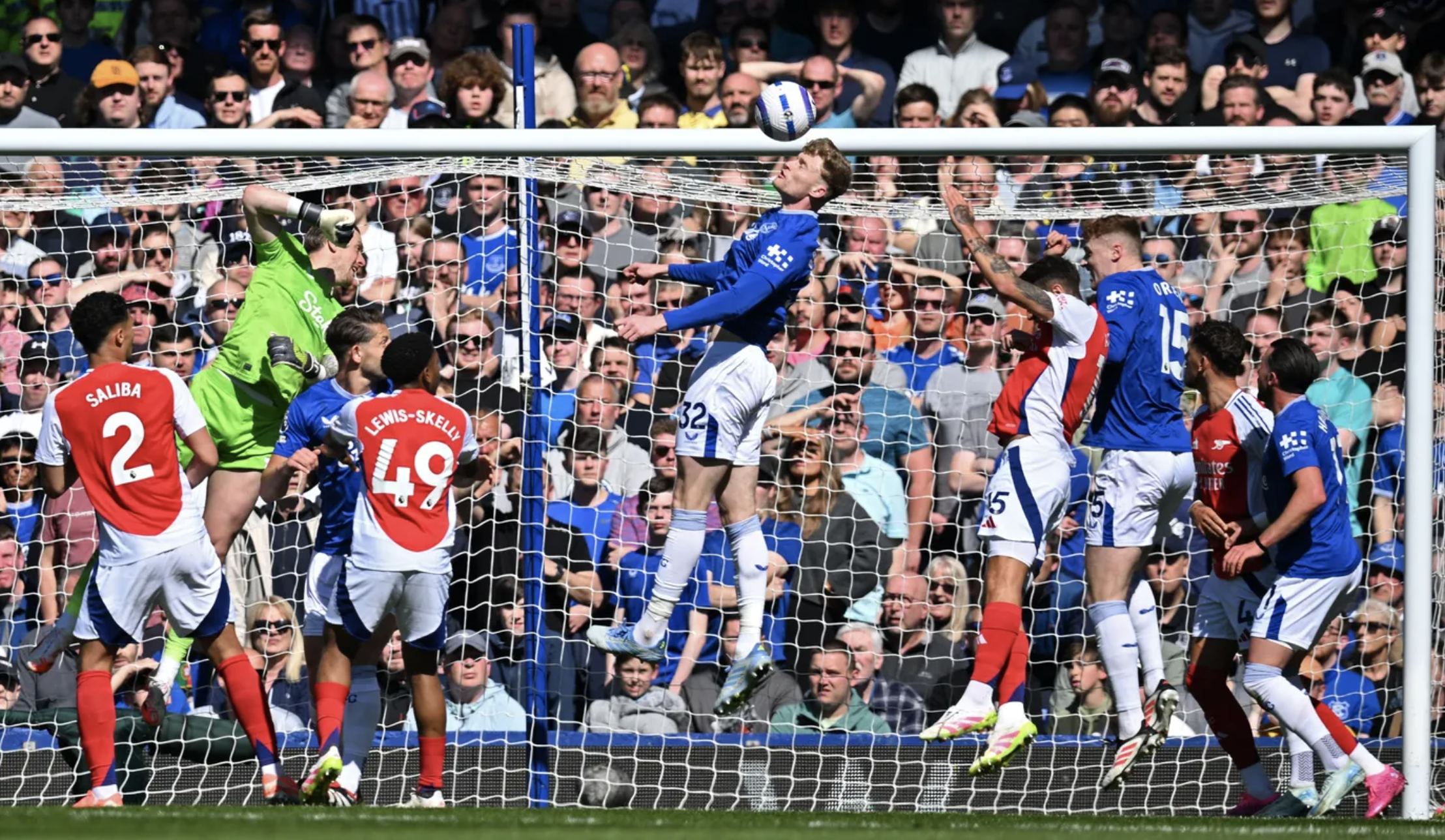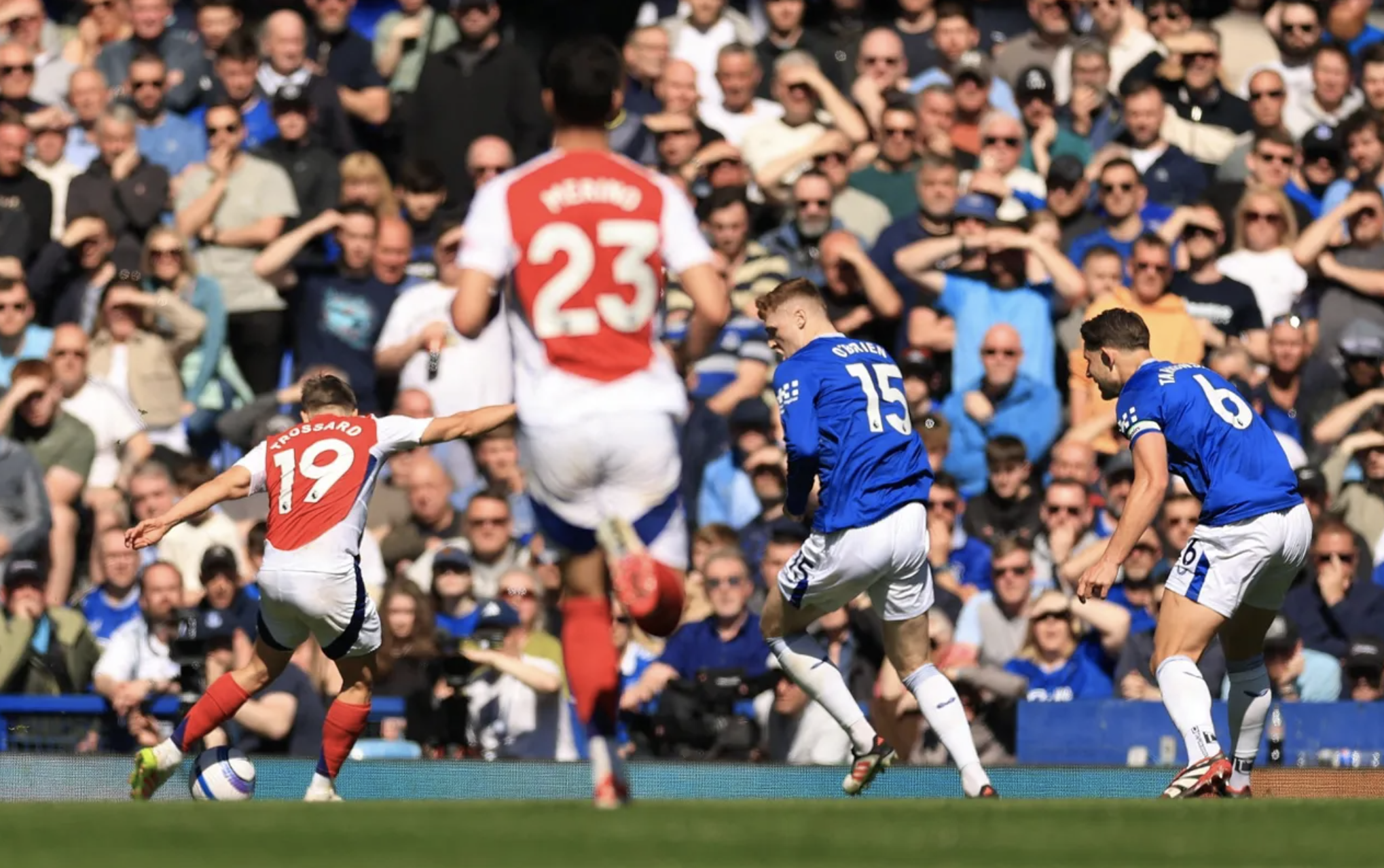 Thay đến 4 vị trí chính thức so với đội hình xuất phát ở trận thắng Fulham hồi giữa tuần, chưa kể thiếu vắng sự phục vụ của trung vệ Gabriel Magalhaes vì chấn thương, Arsenal không thể tạo được thế trận áp đảo trước đội chủ sân Goodison Park. Cơ hội đầu tiên đến với "Pháo thủ" ở phút 12 khi Declan Rice đá phạt góc đưa bóng nhắm thẳng vào góc cao khung thành Everton, may cho Everton khi trung vệ Jarrad Branthwaite kịp đánh đầu giải vây.
