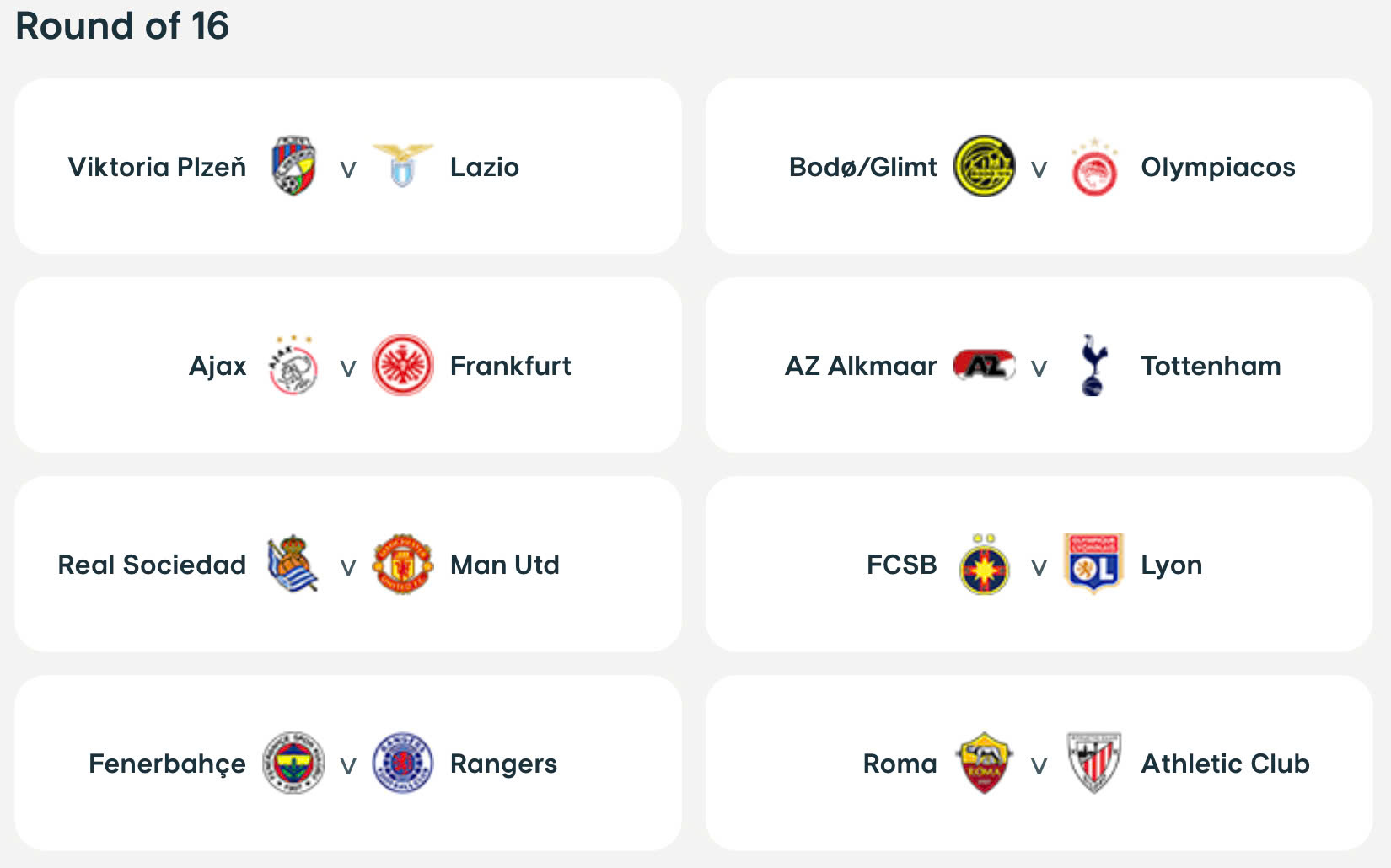 Tại vòng 1/8 Europa League, thử thách cũng đến sớm với các ứng viên nặng ký, khi AS Roma chạm trán Bilbao, Fenerbahce đối đầu Rangers, Sociedad gặp Man United còn AZ Alkmaar so tài cùng Tottenham.