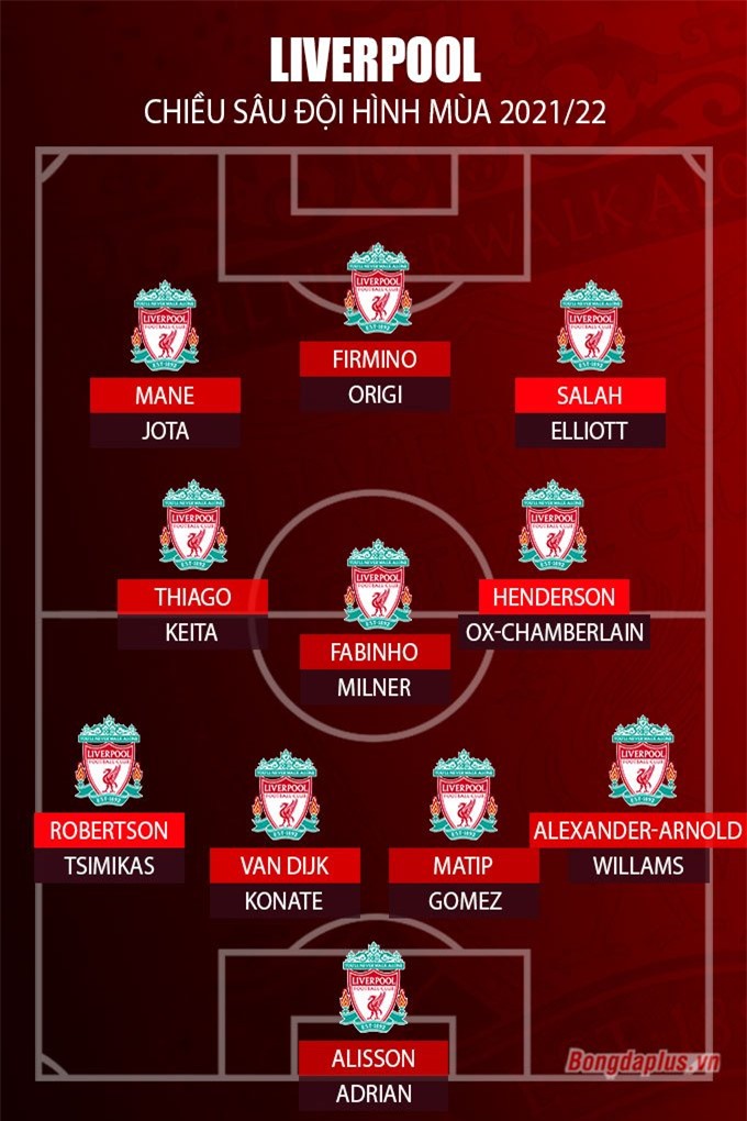 Ở hàng tiền vệ, việc Wijnaldum ra đi có thể khiến The Kop thiếu đi kinh nghiệm nhưng họ được bù đắp bằng sức trẻ của những Harvey Elliott và Curtis Jones. Ở phía trên, vị trí số 9 vẫn chưa thể yên tâm khi Roberto Firmino sa sút còn Diogo Jota hay chấn thương.