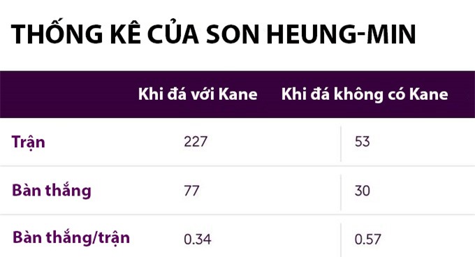 Thậm chí, thống kê còn cho thấy Son hiệu quả hơn khi không có Kane bên cạnh. Theo đó, Trong 227 trận thi đấu cùng Kane, Son có được 77 bàn với hiệu suất 0,34 bàn/trận. Trong khi ở 53 trận không có Kane, Son ghi được 30 bàn với hiệu suất lên đến 0,57 bàn/trận, tức gần gấp đôi.