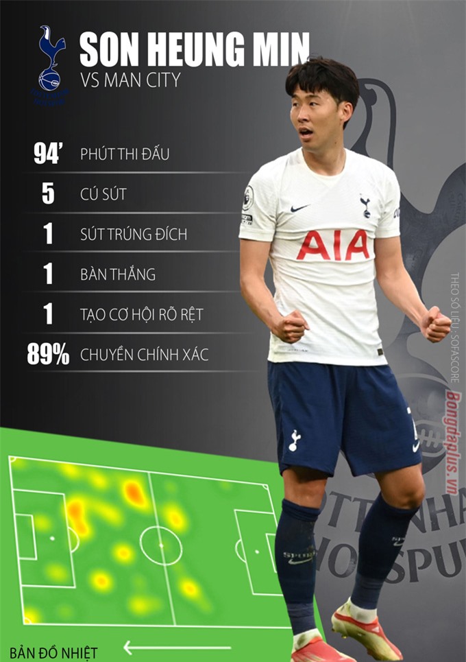 Son đã hoạt động cực kỳ năng nổ ở trận Tottenham vs Man City với 1 bàn thắng sau 1 cú dứt điểm trúng đích. Anh có 2 lần dứt điểm đi chệch khung thành và 2 cú sút bị chặn lại, chuyền chính xác 89% và 2/3 lần thắng tranh chấp tay đôi.