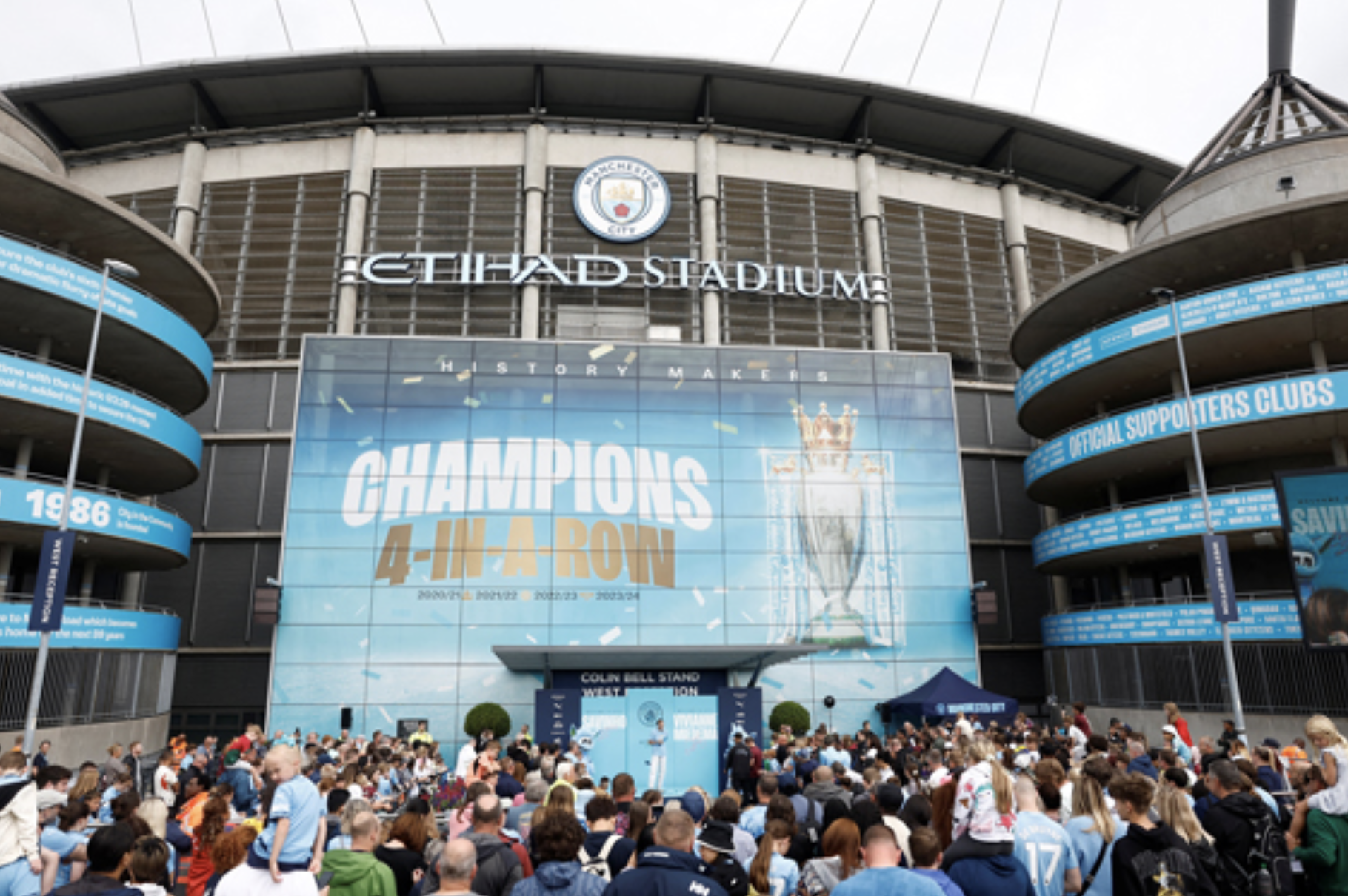 Sân Etihad trong ngày Man City mừng lần thứ 4 liên tiếp vô địch Giải Ngoại hạng Anh