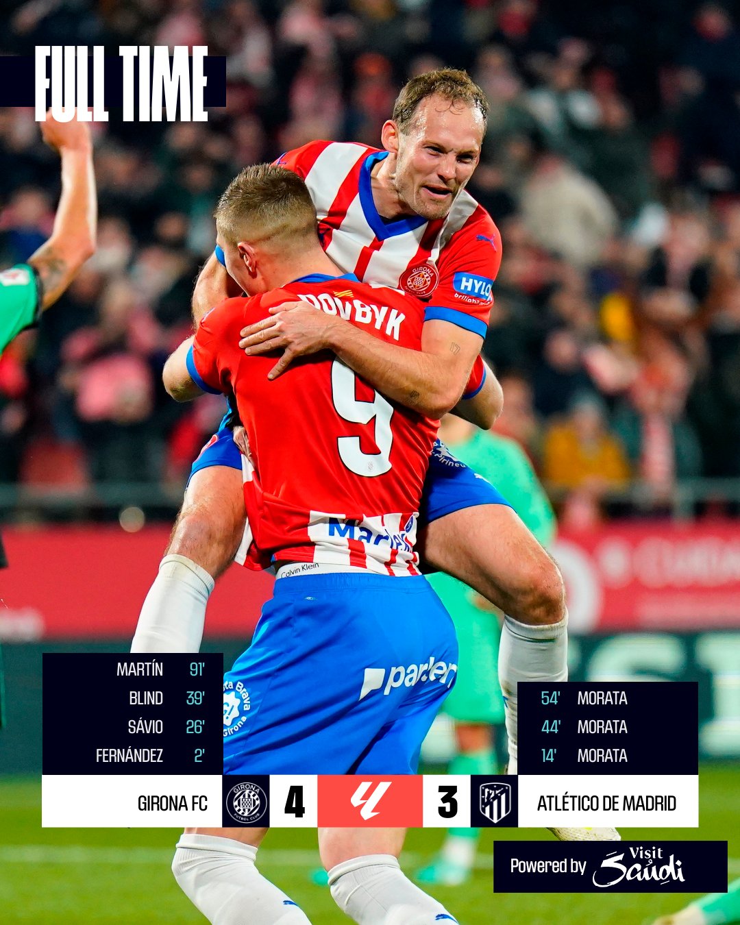 Tưởng chừng như 2 đội sẽ chia điểm thì đúng vào phút bù giờ đầu tiên, Ivan Martin đã trở thành người hùng của Girona khi ghi bàn thắng quan trọng, ấn định thắng lợi chung cuộc 4-3 cho đội chủ nhà trước Atletico Madrid.