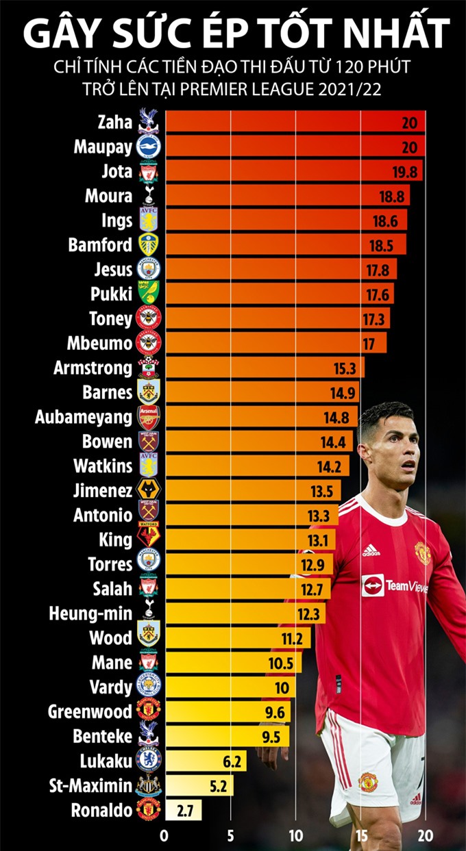 Nhưng theo số liệu thống kê được The Athletic công bố, Ronaldo chỉ có 2,7 lần gây sức ép lên hàng thủ đối phương mỗi 90 phút. Điều này khiến anh trở thành tiền đạo gây sức ép tệ nhất giải đấu. Thống lê của Ronaldo thấp nhất so với bất kỳ tiền đạo nào đã chơi ít nhất 270 phút cho đến nay tại giải Ngoại hạng Anh 2021/22.