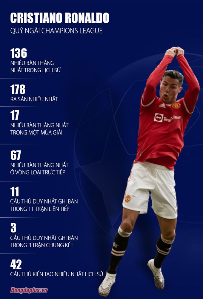 Theo thống kê, trong 178 lần xuất trận ở giải đấu cấp CLB danh giá nhất châu Âu, Ronaldo có tổng cộng 54 trận cho Man United, 101 trận cho Real và 23 trận cho Juventus. Cầu thủ 36 tuổi đã có 5 lần đăng quang ở Champions League, trong đó có 4 lần trong màu áo Real Madrid và 1 lần trong màu áo nửa đỏ thành Manchester.